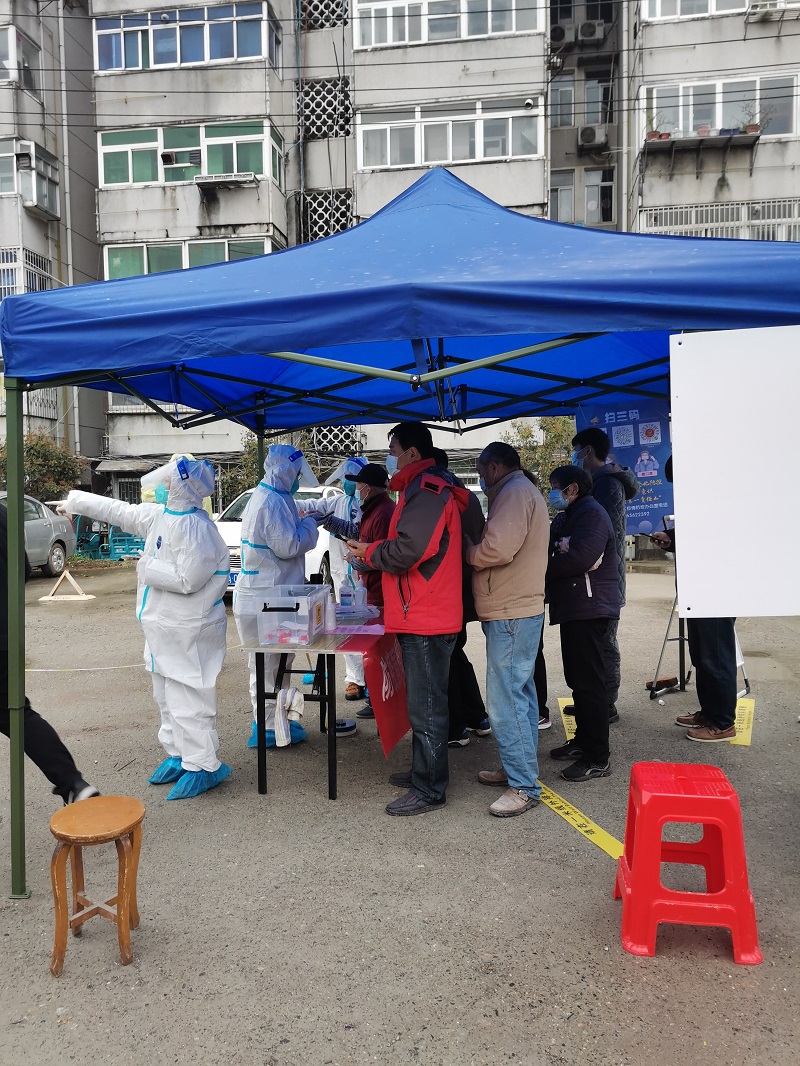 当天上午,9名青年志愿者分别在美景人家小区、北环阳光小区等9个检测点各自就位,配戴好防护工具积极配合医护人员开展核酸检测。他们与街道工作人员分工协作,开展协调就近居民有序进行信息采集与确认、咽拭子采样、采样确认单发放、现场清理消毒等工作,通过维护排队秩序,控制排队间距,在最短的时间内顺利完成了检测任务。