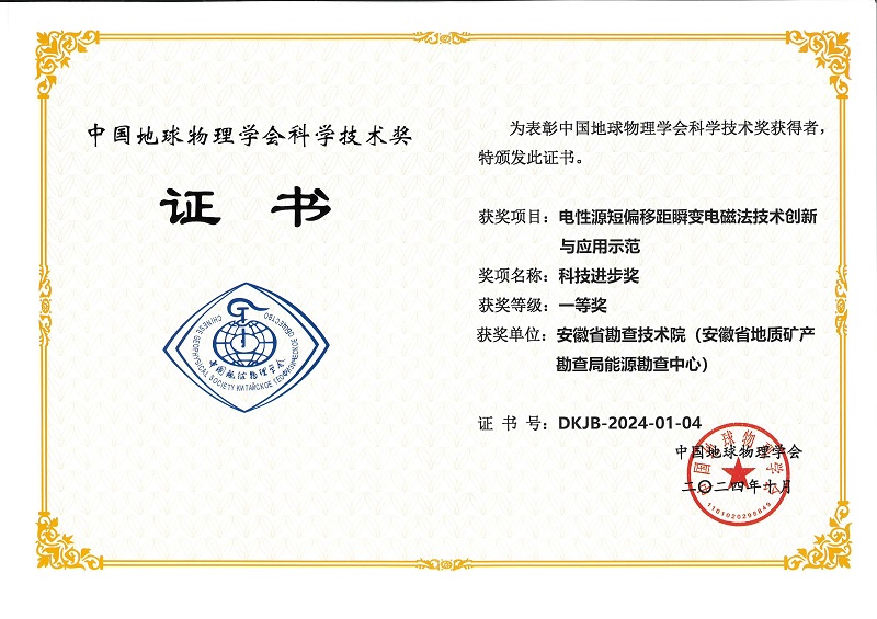 在薛国强研究员的带领下,《短偏移距瞬变电磁法技术创新与应用示范》项目获中国地球物理学会科技进步奖,我院作为主要完成单位之一,项目成果获得中国地球物理学会科技进步奖一等奖。
