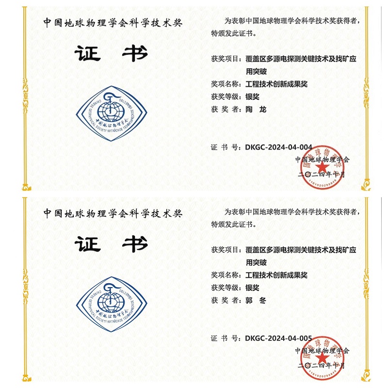 中国地球物理学会科技进步奖一等奖是我院与中国科学院地质地球物理所薛国强研究员团队密切合作的优秀成果。在薛教授的邀请下,我院参与编写中国地球物理学会团体标准《短偏移距瞬变电磁法勘探技术规程》,并于2021年发布实施,2023年末,利用其创立的短偏移距瞬变电磁法在我院西湾地区开展方法试验工作,形成了“科学家+工程师”的联合攻关团队,为我院技术攻关提供很大帮助,扩大了找矿成果。