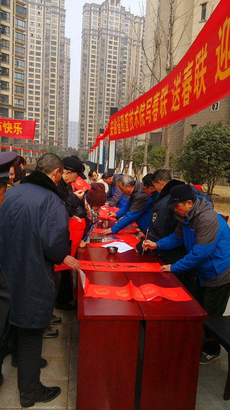 2月4日下午,合肥地矿家园小区内,院纪委书记李东海及张永德、穆晓红、苏根波、戴传慧、何援军等爱好书法的在职、退休职工为广大业主现场免费写“福”字和春联。