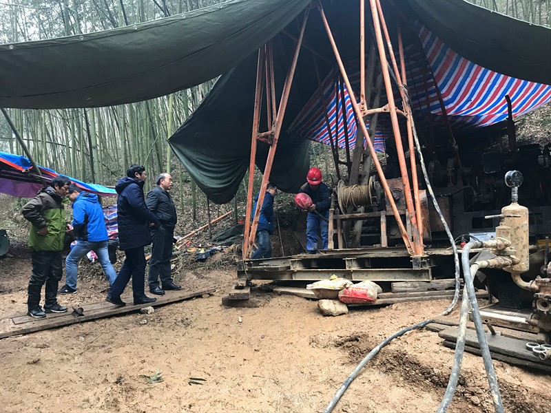 此次电法所承担的《安徽省宁国市梅林镇-金子山地区金多金属矿普查》项目布设的第二批钻孔,对项目实施及地区找矿具有重要意义。何家国在项目工听取项目负责人汇报后直接前往钻孔布设位置,查看地层构造及钻机架设情况,并亲自测量了方位角和钻杆斜度。