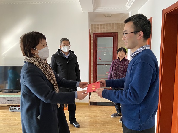 在困难党员郁磊家中,王永娟送上新春问候和节日慰问品、慰问金,并亲切询问了他的工作情况、家庭生活状况、家人身体状态等,仔细了解他目前生活上遇到的实际困难,为他出谋划策、加油打气。王永娟鼓励郁磊要保持积极乐观的生活态度,进一步坚定战胜困难的信心;同时嘱咐他在春节到来之际、在防范新冠病毒的重要时期,要加强防护措施,保护好自己和家人的身体健康。