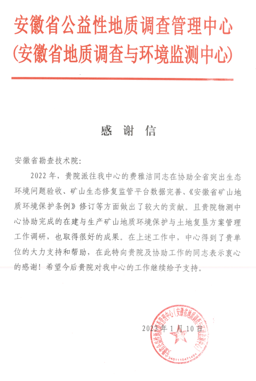 1月10日,我院收到省公益性地质调查管理中心感谢信,信中感谢了我院物测中心在安徽省在建与生产矿山地质环境保护与土地复垦管理工作调研中做出的贡献,高度赞扬了费雅洁同志在全省突出生态环境问题验收、矿山生态修复监管平台数据完善、《安徽省矿山地质环境保护条例》修订等方面做出的贡献。
