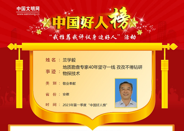 兰学毅,男,1961年12月生,中共党员,我院教授级高级工程师。他长期坚守地质勘查一线,40多年孜孜不倦钻研物探技术,从一名普通的野外勘探队员成长为跨专业的综合物探工作者和国内知名的地球物理专家,有省部级科技成果5项,出版专著7部,在全国矿产资源潜力评价重大专项中获得突出成果,部分矿床类型的预测方法属于行业首创,具有显著的推广应用价值和社会效益。工作中,他还是年轻人心目中的良师益友,倾囊相授帮助年轻人成长。2021年7月获评“安徽好人”。