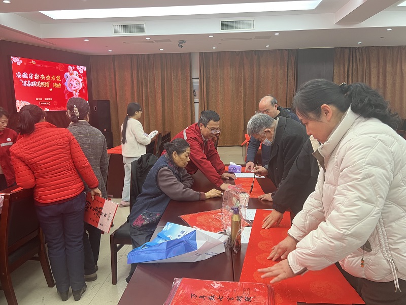 本次活动特邀请安徽省书法家协会会员戴传慧老师及贾吉祯老师亲临活动现场为院广大职工书写春联。活动现场,红纸铺开,墨香四溢,书法家和书法爱好者们挥动着手中的毛笔,或行云流水,或刚劲有力,将一句句吉祥如意的祝福语跃然纸上。“金蛇贺岁家宅旺,紫燕迎春富贵长”“新春吉祥迎富贵,蛇年如意接平安”等春联,不仅表达了职工对新年的美好愿景,也反映了对美好生活的向往。大家手捧春联,脸上洋溢着幸福的笑容,纷纷表示要将这份祝福带回家中,与家人共度一个温馨、祥和的新春佳节。此次活动共送出春联和“福”字200余副。