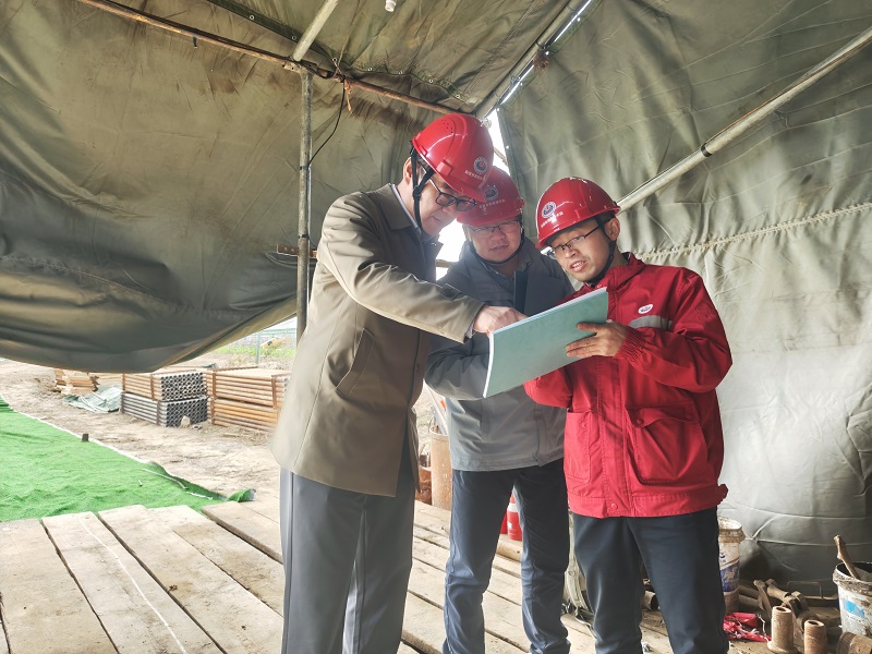 在钻机施工现场,姚波实地查看了钻孔开孔布局、设备运行状态及施工工艺流程,详细询问了项目进度。他强调,安全生产是项目推进的红线,要严格落实安全生产责任制,规范操作流程,做好钻机设备维护;要做好施工人员防寒保暖,合理调整作业时间,确保人员健康和施工安全有序推进。