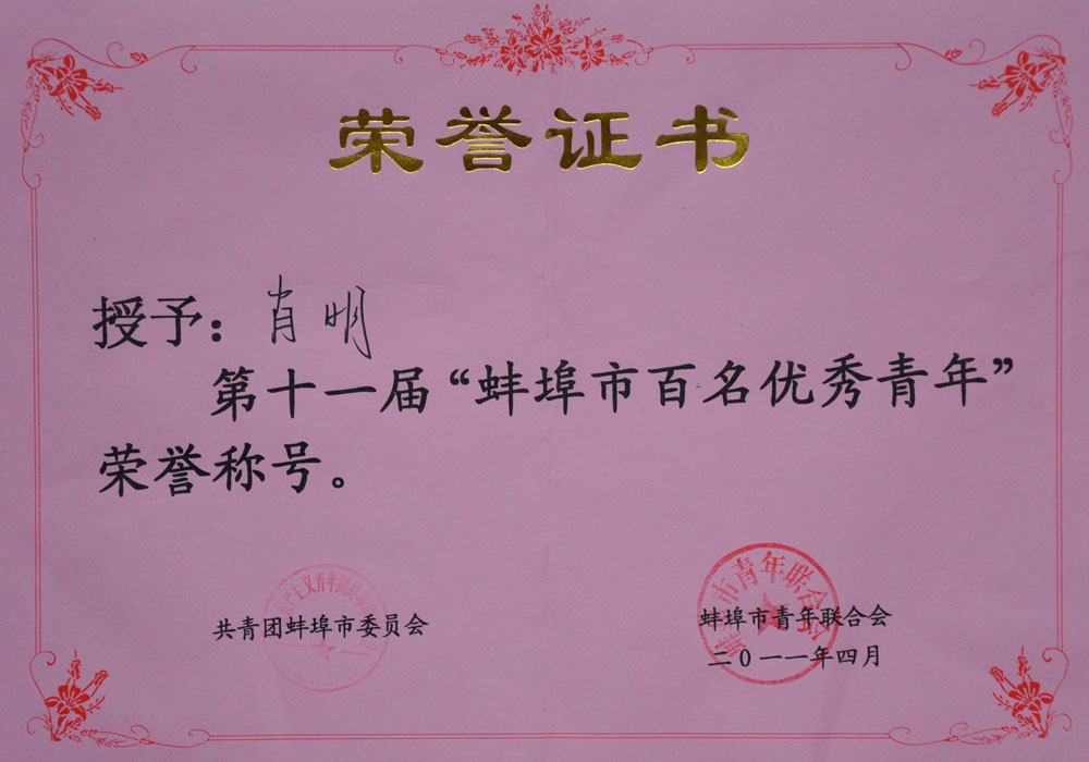 肖明获蚌埠市“百名优秀青年”称号