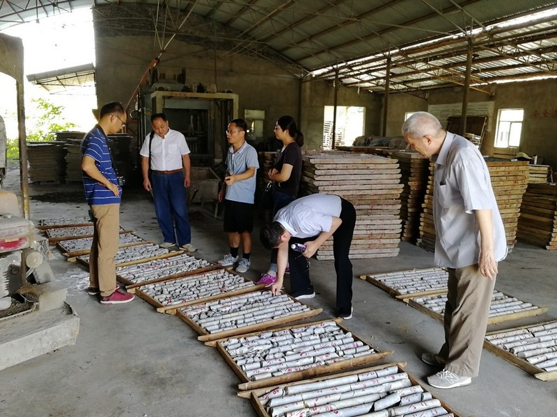 7月25日上午,江苏省地质调查研究院肖书明副总工程师、矿产所王丽娟副所长、魏邦顺高工和江苏省国土厅专家陆瑞宝教授级高工一行6人来“安徽省宣城市荞麦山东铜多金属矿普查”项目进行考察交流。洪大军所长向考察专家介绍了荞麦山-茶亭一带地质情况,并就该地区找矿方向及成矿条件同专家深入交换了意见。江苏省地质调查研究院专家仔细观察了该项目ZK3601孔岩心,认为该地区找矿前景良好,钻探工作取得了较好的成果,为江苏省高淳地区寻找类似矿床提供了地质依据,并就以后两家单位进行项目合作达成一致意见。