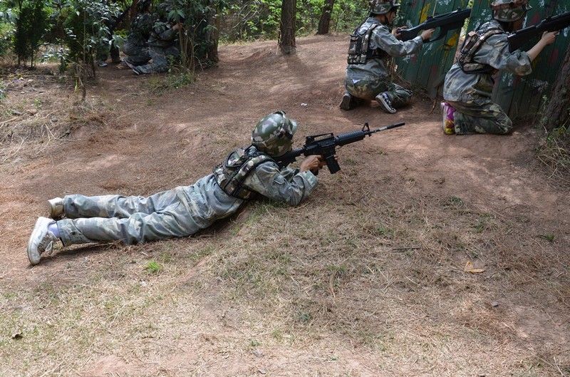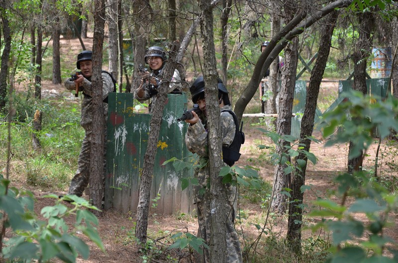 第二局,代号“斩首行动”。红队的任务就是保护一名重要官员避免被蓝队队员击杀并得保证有两名以上的保卫。我们蓝队在战壕中讨论战术并给队员们安排了任务,女队员在正面借助掩体拖住对手主力,我们几名枪法较好的男队员,从两侧快速包抄到后方去寻找并击杀这名官员。结果证明我们的战术涉险成功,虽然没有击杀掉官员,但由于和身边的保卫走散,裁判还是判定了蓝队的胜利。