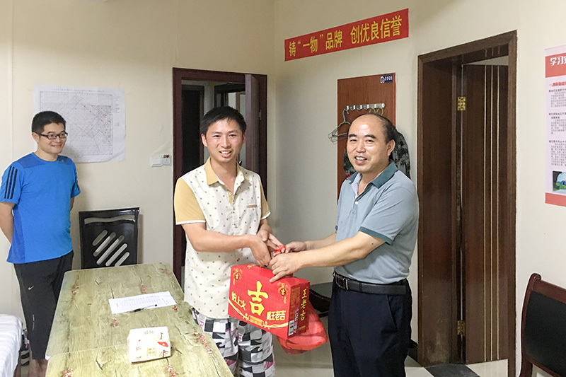 何家国来到“长江中下游成矿带安庆-盱眙地区地质矿产调查2017年物探工程”项目驻地,亲切慰问坚守野外一线作业的职工,并送上了凉茶、毛巾等慰问品。