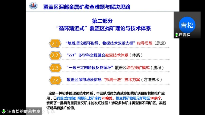 300人容量的线上会议,“座”无虚席。汪青松教授面对电脑,激情不减,围绕着“覆盖区深部金属矿勘查难题与解决思路”的课题,逐章讲述。遇到重点、难点,他平日里声情并茂的讲课风格同样在线,抑扬顿挫间将问题剖析清楚。课后的交流环节中,他就与会人员提出的一些问题作出回答。一场长达两个多小时的线上授课,获得了线上学员的诸多好评。