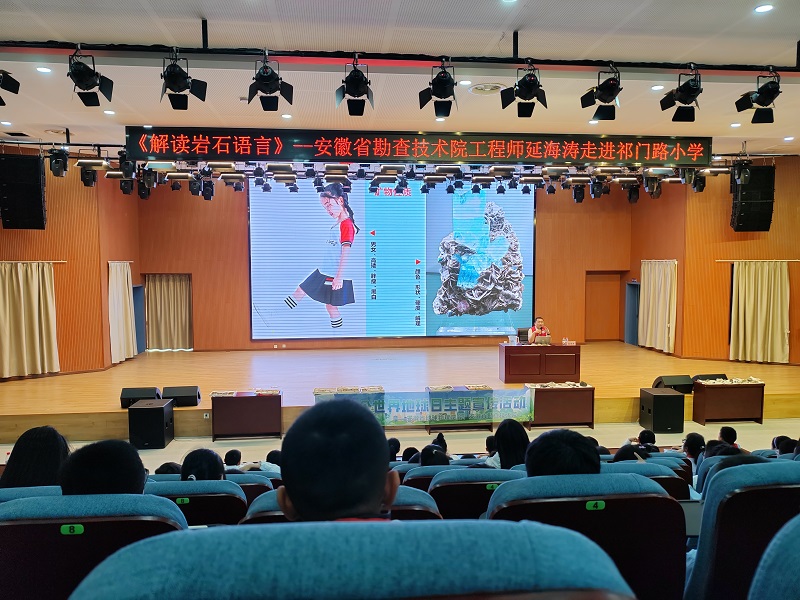 4月23日,科普团队走进合肥市屯溪路小学祁门路校区,打造沉浸式地球课堂。工程师延海涛以《岩石会说话》为题,结合AR数字技术展现岩石演化历程,带领学生破解“矿物密码”。活动现场设置“小小地质家”互动专区,陨石标本、水晶晶簇等30余件展品引发阵阵惊叹,孩子们通过显微镜观察矿物微观世界,零距离触摸地球亿万年时光印记。