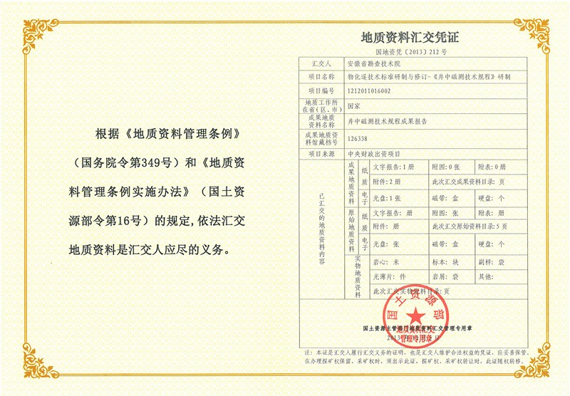 由我院测井中心主任刘冬节同志主编的《井中磁测技术规程》目前已完成资料汇交有关程序,11月5日收到了国土资源部全国地质资料馆发送的《地质资料汇交凭证》。