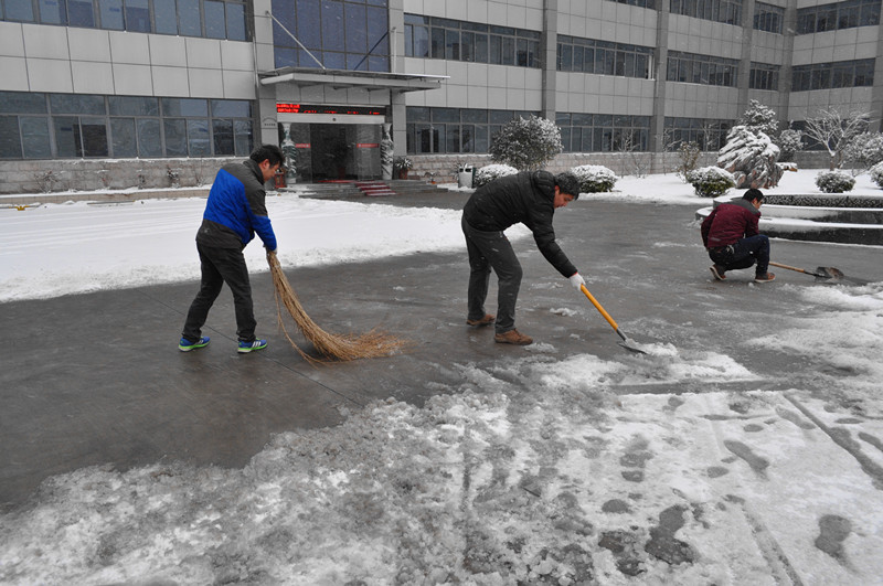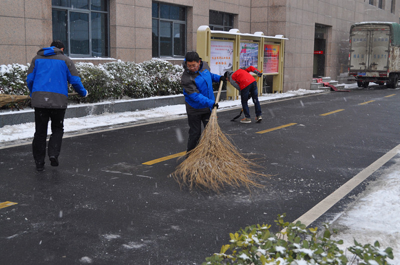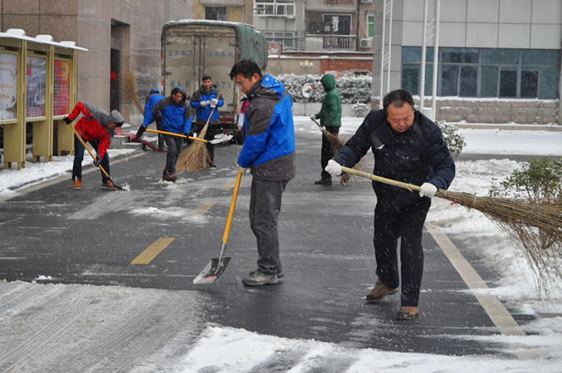 为保障广大干部职工出行安全,11月28日一大早,院长许传建、副院长汤正江和纪委书记李东海带领后勤服务中心、院办公室、安保科等科室部门的干部职工,在办公楼区域开展积雪清扫工作。他们有的用笤帚清扫,有的拿着铁锹铲雪。此时天空仍然纷纷扬扬飘着雪花,天气也格外寒冷,大家的双手和脸都冻得通红,一不小心雪水就从鞋帮里渗进去,弄湿了鞋袜,却丝毫没有影响大伙儿的干劲。